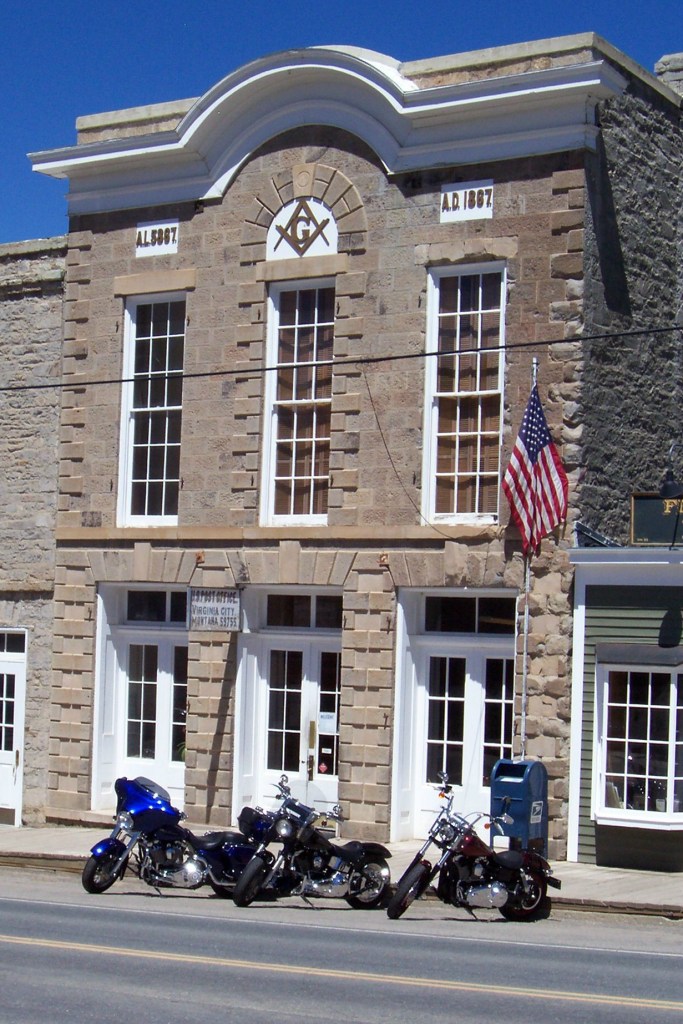 Here is a study in contrast from the main street of Virginia City, Montana. Three modern motorcycles (most likely Harley’s) are parked in front of the Masonic Temple building (dated 1867). Virginia City served as the second territorial capital of the Montana Territory, and it now serves as the County Seat of Madison County in southwestern Montana.