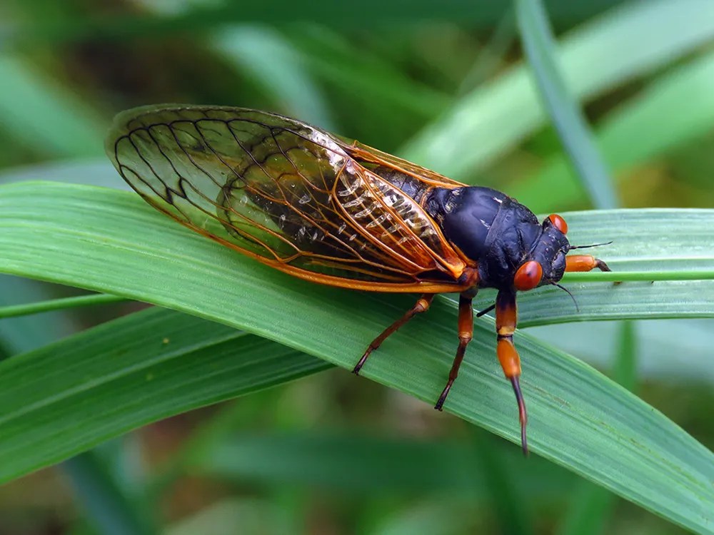 Adult cicadas are large, flying insects with bulging eyes and veined wings. Nymphs appear as stocky and grublike with legs. After reaching adulthood, the average lifespan of a cicada is 3-4 weeks.