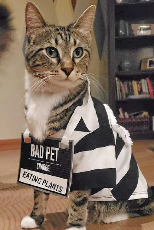 Last night, I climbed up on a bookshelf high above the master bedroom floor. There was a pot with a houseplant in it. I just couldn’t help myself. I pulled and pulled with my teeth and claws until most of the plant and dirt flew out and landed on the bed.
